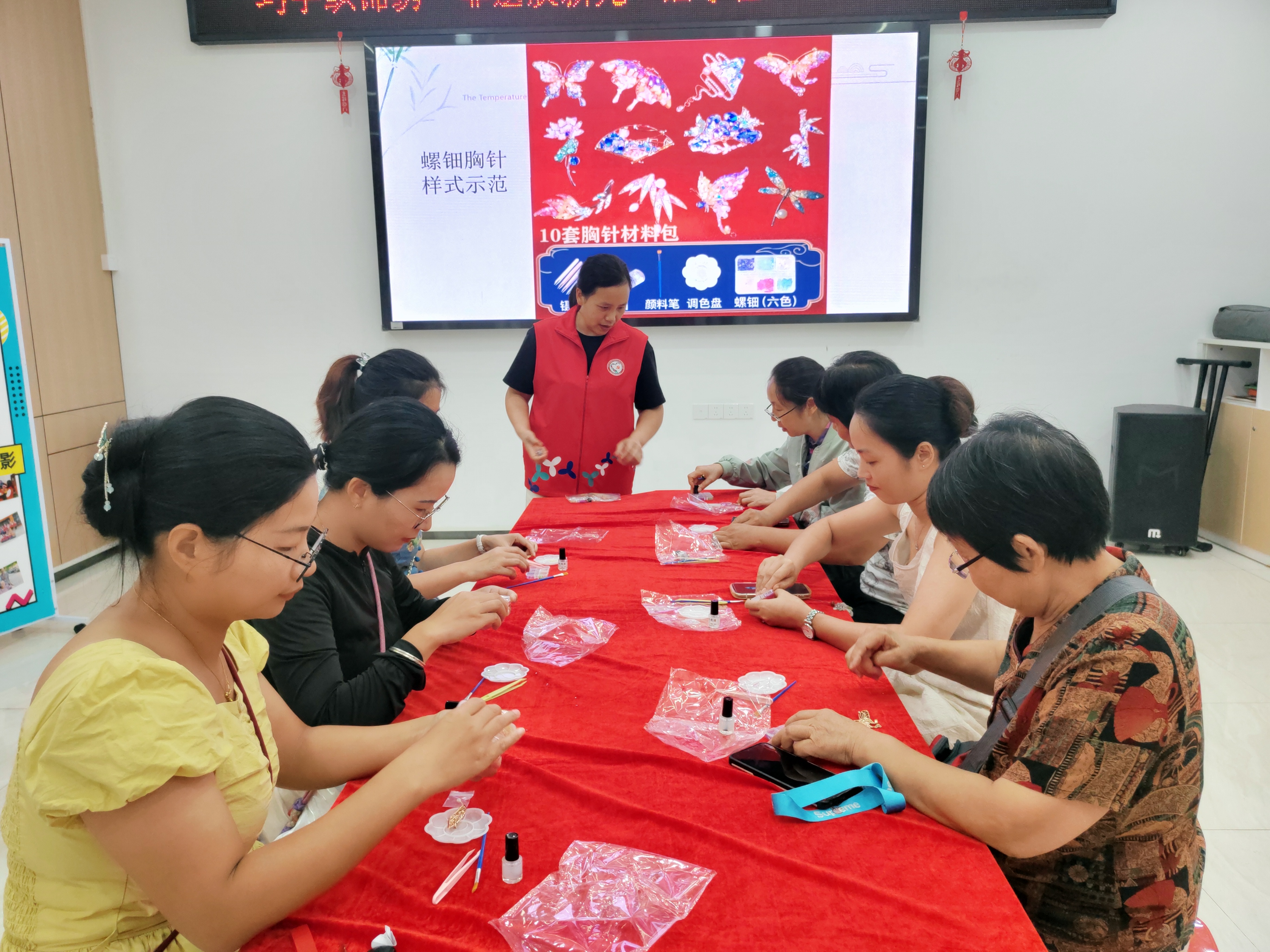 小组以“破冰融合”开启首节课程。社工通过趣味游戏打破成员隔阂,共同制定小组契约并明确“学习非遗技艺·增强自信力量”的成长目标。在随后的三节手工创作中,社工采用讲解加实操模式,带领全职妈妈们了解非遗历史文化并学习宋锦发夹的制作、螺钿胸针的贝壳镶嵌、缠花发簪的丝线缠绕等传统工艺。从材料认知到技法精进,妈妈们手持镊子、缠线轮等工具,将零散部件化作精美的非遗作品,现场不时响起互相指导的温馨交流声。