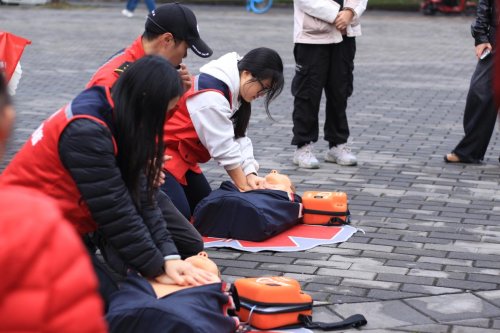 在活动实施过程中,大学城社区高校应急志愿者与专业教官团队于活动开始前完成现场布置与居民签到引导,随后在专业导师的带领下,组织居民分批次使用专业教具开展成人心肺复苏技能与自动体外除颤仪使用方法的理论学习和实操练习,对积极参与的居民发放急救盒作为激励。实操环节结束后,志愿者们向参与居民分发 “急救手册”,强化居民对健康安全的重视。