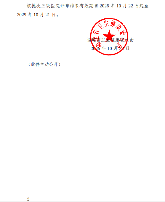 2025年10月22日,福建省卫生健康委员会发文公布2025年度第二批次三级医院评审结果,厦门市第五医院正式通过三级医院等级评审,确定为三级甲等综合医院。