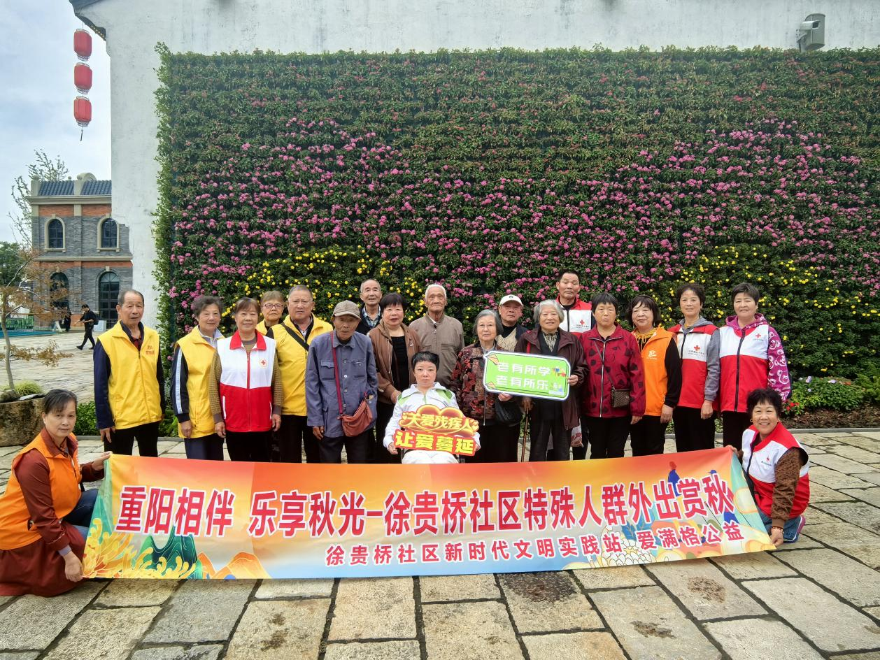 深秋时节,天朗气清,温暖的阳光驱散了丝丝凉意,又逢重阳佳节,为让社区的高龄空巢老人、失独家庭以及重度残疾人朋友感受到社会的关怀与温暖,丰富他们的精神文化生活,10月31日,徐贵桥社区携手爱满格公益举办了以“重阳相伴 乐享秋光”为主题的关爱弱势群体秋游活动,组织高龄空巢老人、独居老人、残障同胞等前往古韵悠然的堰桥天上村前文化街区,共同收藏一份独特的秋日记忆。
