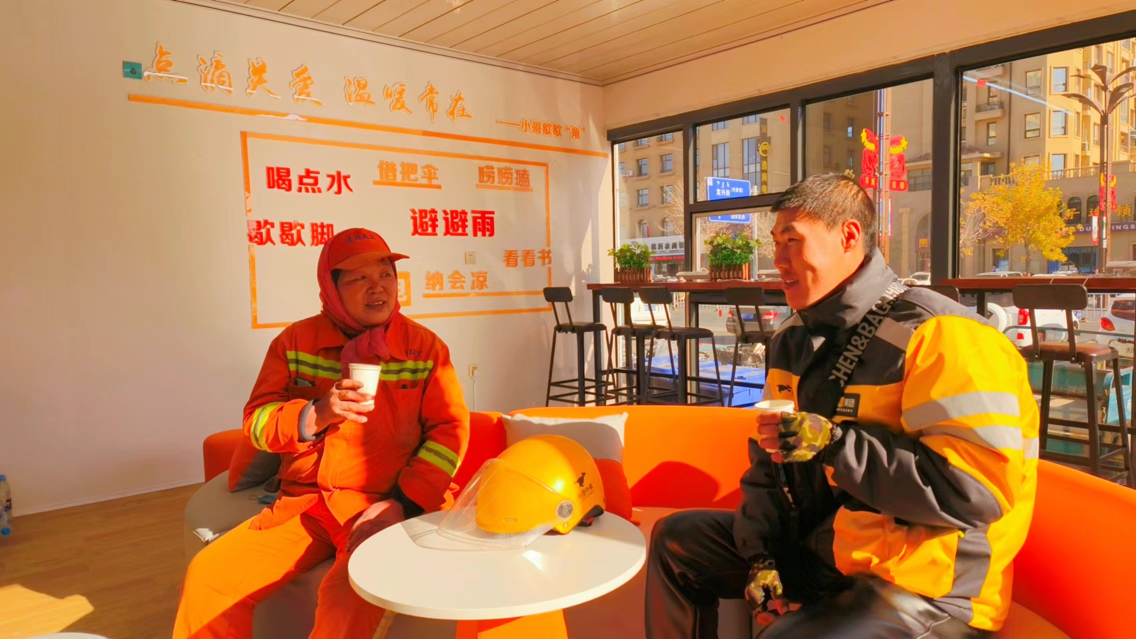 服务站整合边角空间,建起16处暖心驿站,桌椅、热水、充电插座一应俱全,还引入了9位有理发、缝纫手艺的老师傅。外卖小哥张志超送完午高峰最后一单,习惯性地走进驿站:“以前累了只能在车上靠会儿,现在能坐下歇脚,冬天有暖气,夏天有凉茶,心里特别暖。”